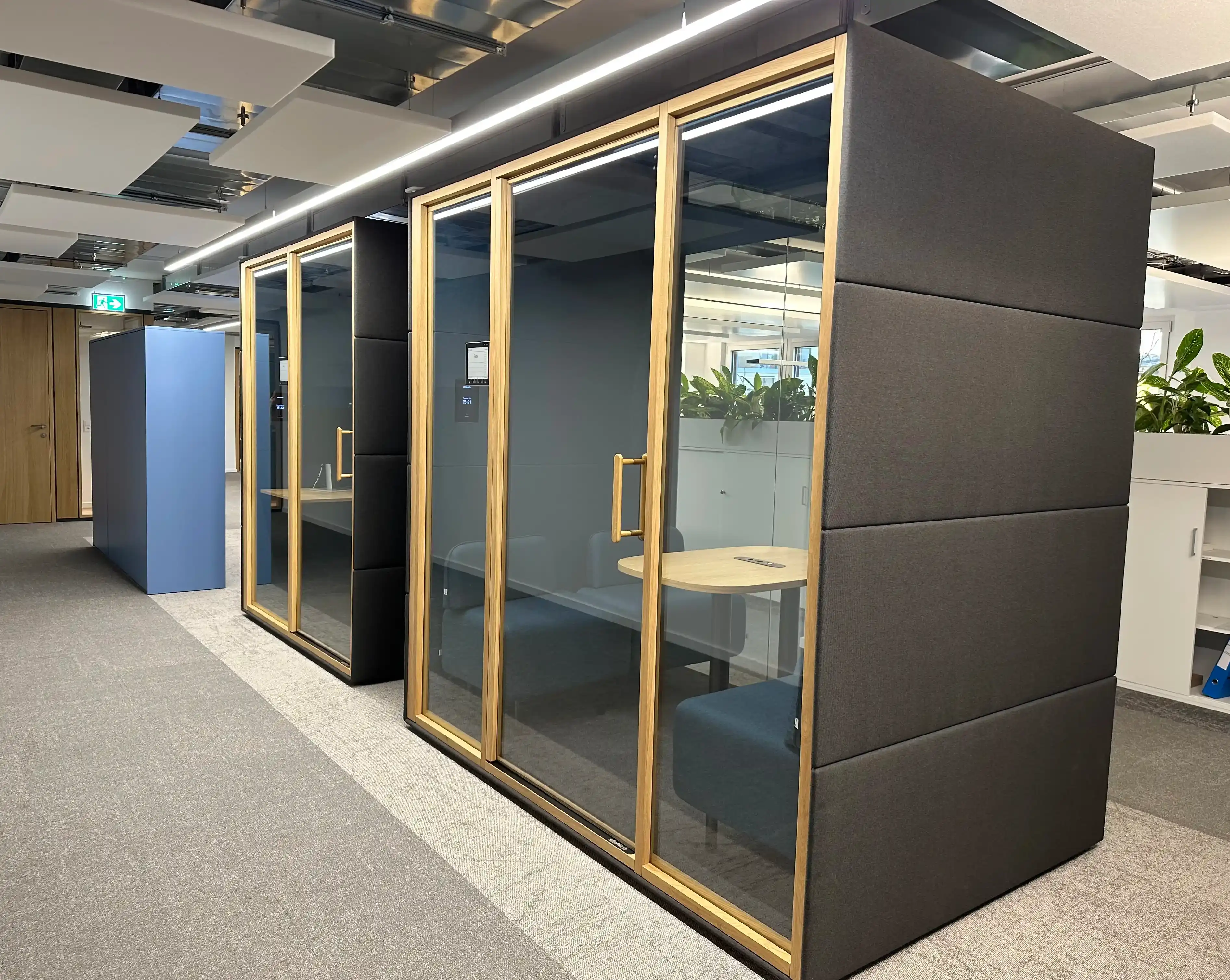 - Rückzugsmöglichkeiten: Akustikboxen und andere Rückzugsmöglichkeiten stehen dir zur Verfügung, wenn du konzentriert arbeiten möchtest. In einem Ruheraum kannst du dich auch kurz entspannen. Unsere schalldichten Akustikboxen bieten genau das: einen Rückzugsort für Telefonate, Videokonferenzen oder fokussiertes Arbeiten – mitten im Büro, aber fern vom Trubel. Ein Ort, der Ruhe und Effizienz verbindet.
