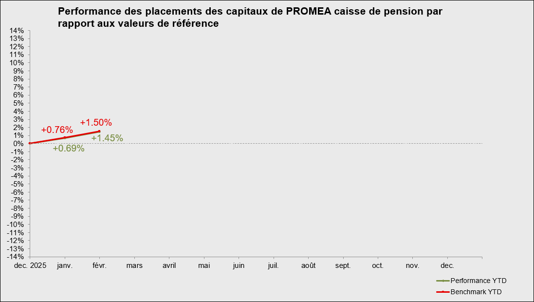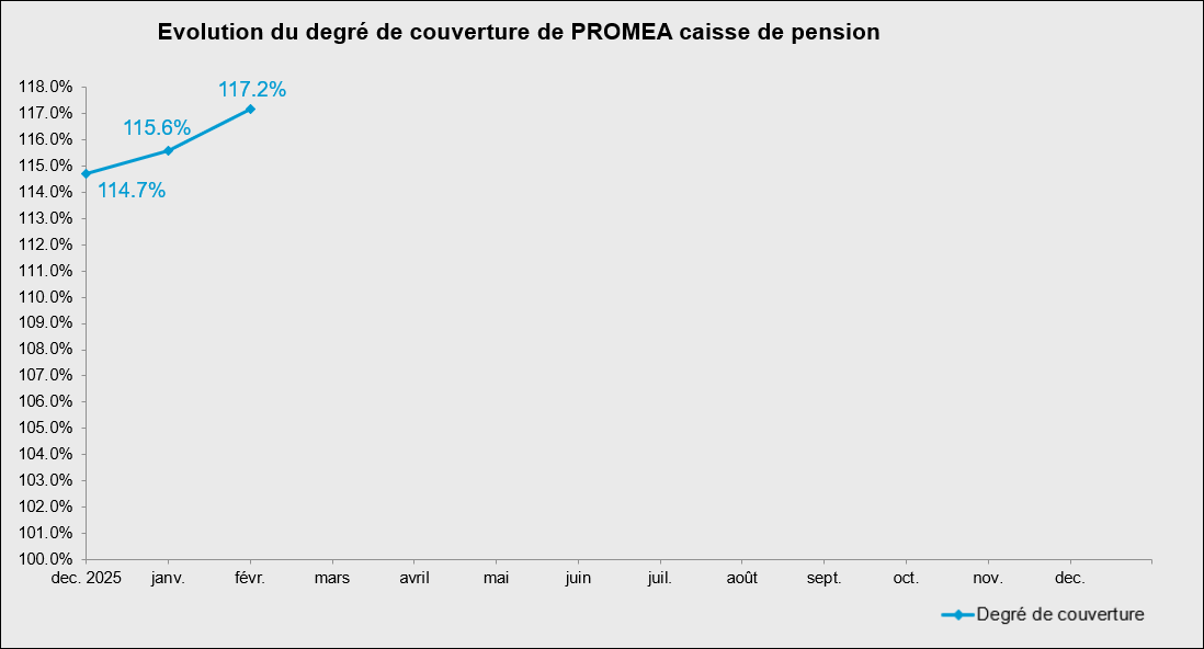Vous trouvez ci-après les chiffres actuels relatifs à la performance des placements et à l’évolution du degré de couverture de l’exercice en cours et des exercices précédents. Veuillez noter qu’en cours d’année, seuls les placements patrimoniaux sont évalués (sans les immeubles). Les engagements de l’institution de prévoyance sont évalués à nouveau exclusivement en fin d’exercice.
