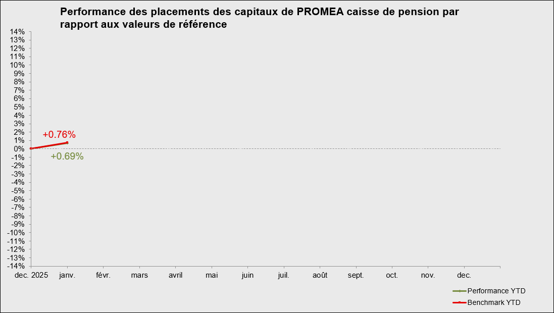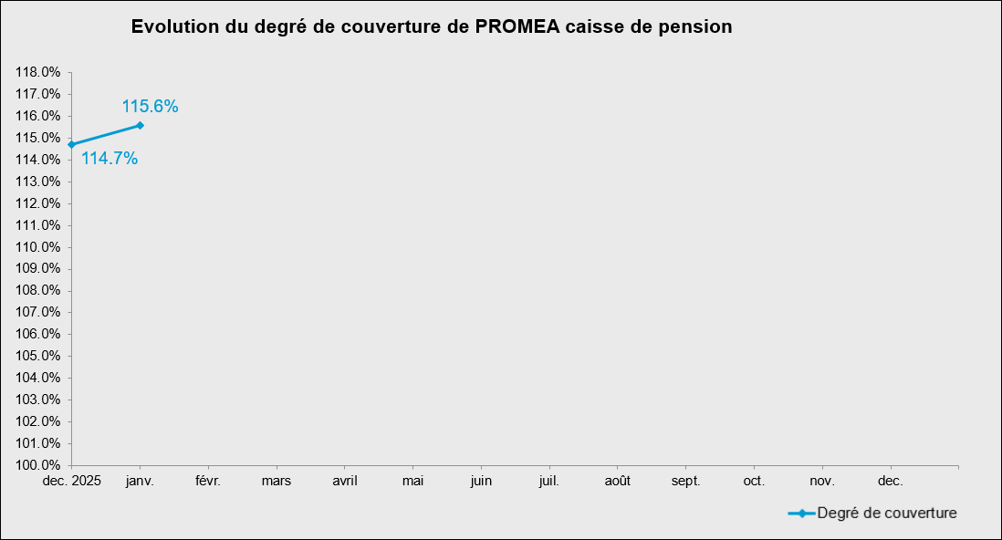Vous trouvez ci-après les chiffres actuels relatifs à la performance des placements et à l’évolution du degré de couverture de l’exercice en cours et des exercices précédents. Veuillez noter qu’en cours d’année, seuls les placements patrimoniaux sont évalués (sans les immeubles). Les engagements de l’institution de prévoyance sont évalués à nouveau exclusivement en fin d’exercice.